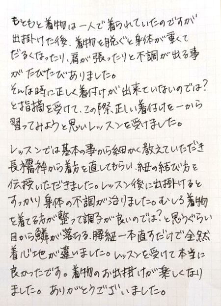 もともと着物は一人で着られていたのですが、出掛けた後、着物を脱ぐと身体が重くてだるくなったり、肩が張ったりと不調が出る事がたびたびありました。