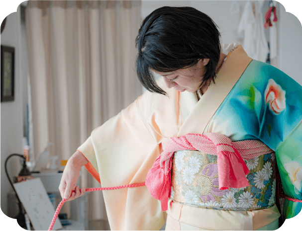 特別な器具は使用せず、昔ながらの紐を使った着付けです。